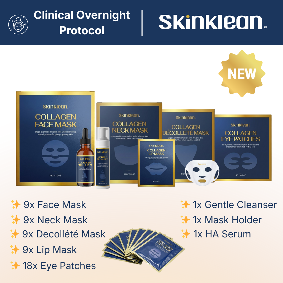 Most skincare evaporates before it works. This complete set preps your skin with a clinical Cleanser & Serum duo, then creates a 'protective seal' from forehead to chest using 5 targeted collagen masks. It locks in moisture and drives deep absorption while you sleep. It’s not just a routine; it’s a total structural renovation.